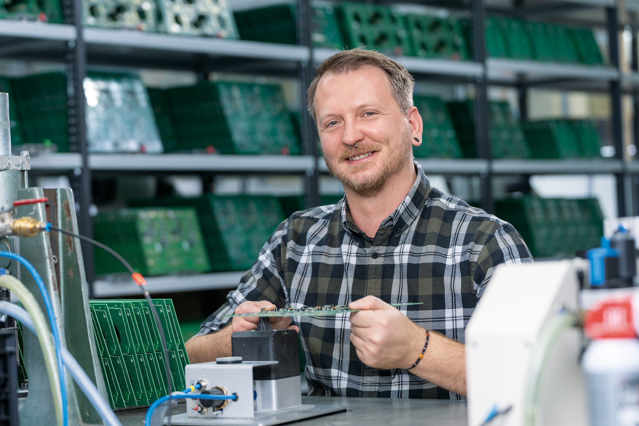 Dominik ist als ehemaliger Lehrling und späterer Produktionsleiter ein wichtiger Repräsentant unserer Firmenkultur. Zudem lebt er technisch einen sehr hohen Anspruch vor. Wenn man dann noch seine besonnene, wertschätzende und auch klare Art berücksichtigt, macht ihn das zum idealen Ausbilder unserer Elektroniker:innen der Zukunft.