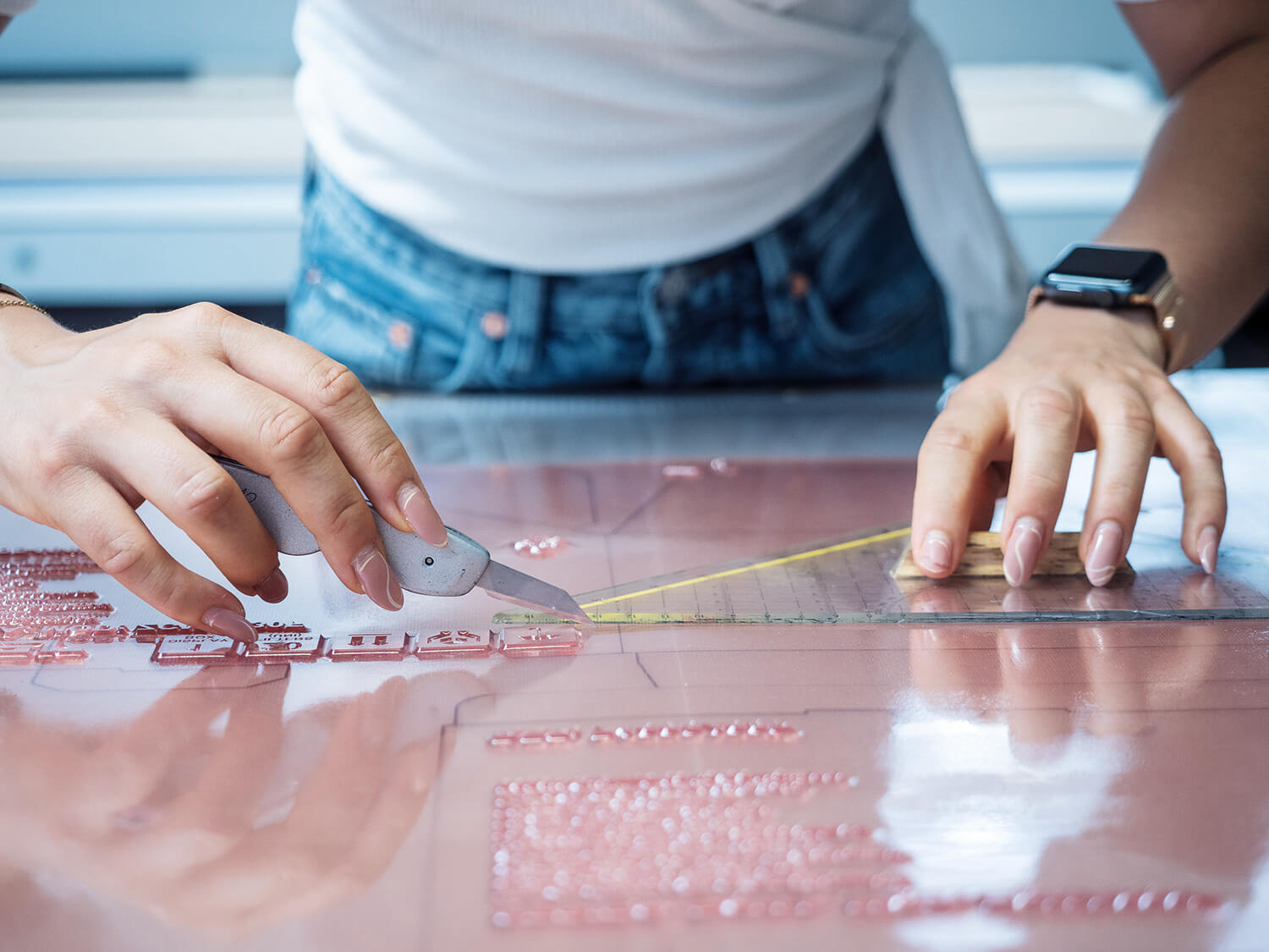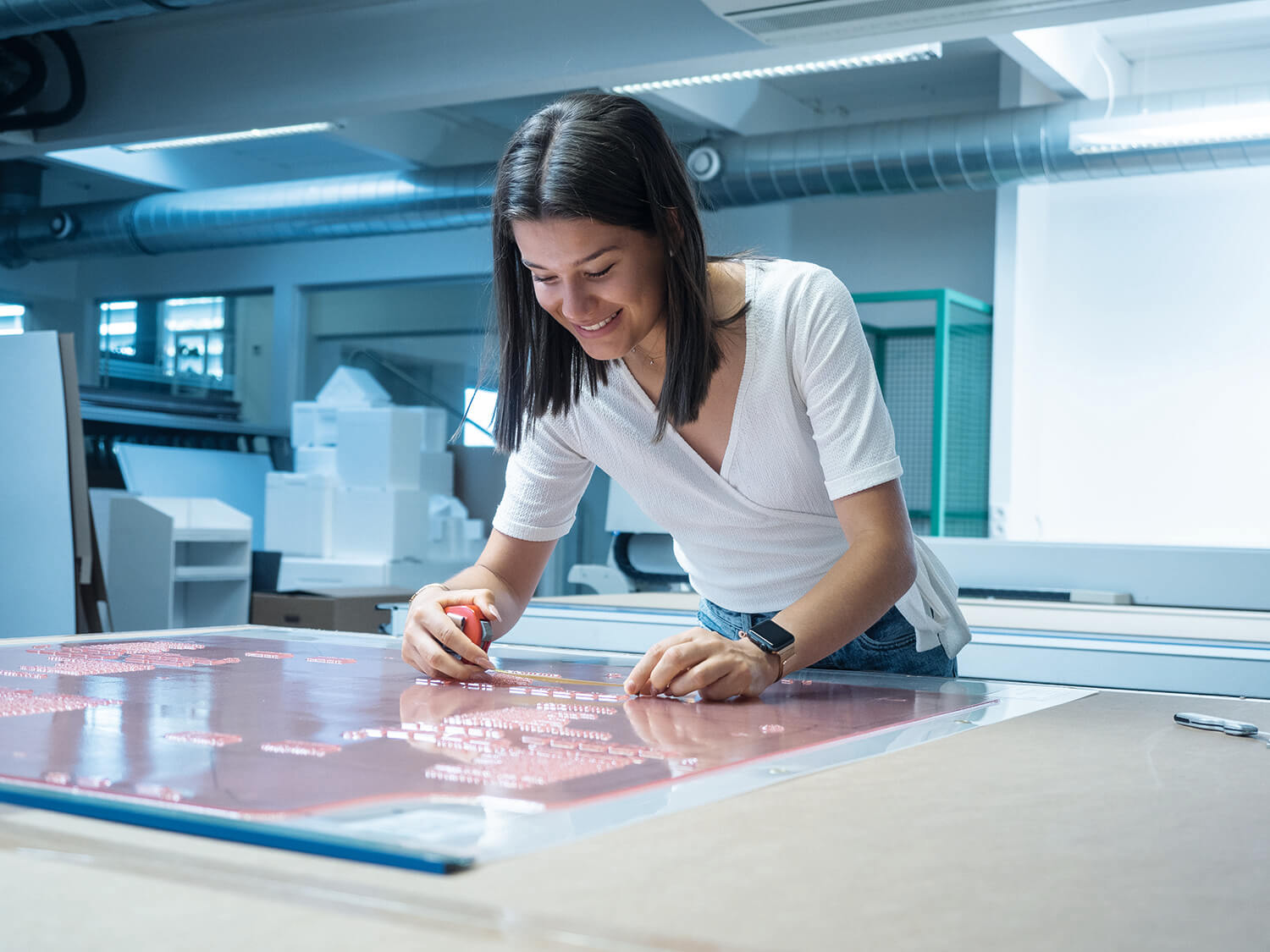Früher auch unter der Berufsbezeichnung „Typografiker:in“ oder „Reproduktionstechniker:in“ bekannt, sind Druckvorstufentechniker:innen für alle Vorarbeiten eines Drucks verantwortlich. Das können Broschüren, Zeitungen und Plakate sein, aber auch Verpackungsmaterialien als Trägermedien für Werbebotschaften. Nicht zu vergessen die Produktion digitaler Medien, auch sie fällt in den Tätigkeitsbereich der Drucktechniker:innen. Das Arbeiten am PC ist in diesem Beruf also unerlässlich. „Ich bearbeite Texte und Bilder am Computer, erstelle Layouts und gebe das fertig gestaltete Druckerzeugnis als Druckform für das vorgesehene Druckverfahren aus, zum Beispiel für den Offsetdruck, den Flexodruck oder Digitaldruck und weitere mehr. Ich bin also die Ansprechpartnerin und zugleich Beraterin bei allen drucktechnischen Fragen für unsere Kundinnen und Kunden, und natürlich auch für unsere Mitarbeiterinnen und Mitarbeiter im Verkauf. Druckabnahmen und Terminkoordination gehören ebenfalls zu meinem Aufgabengebiet“, berichtet Jana Maria.