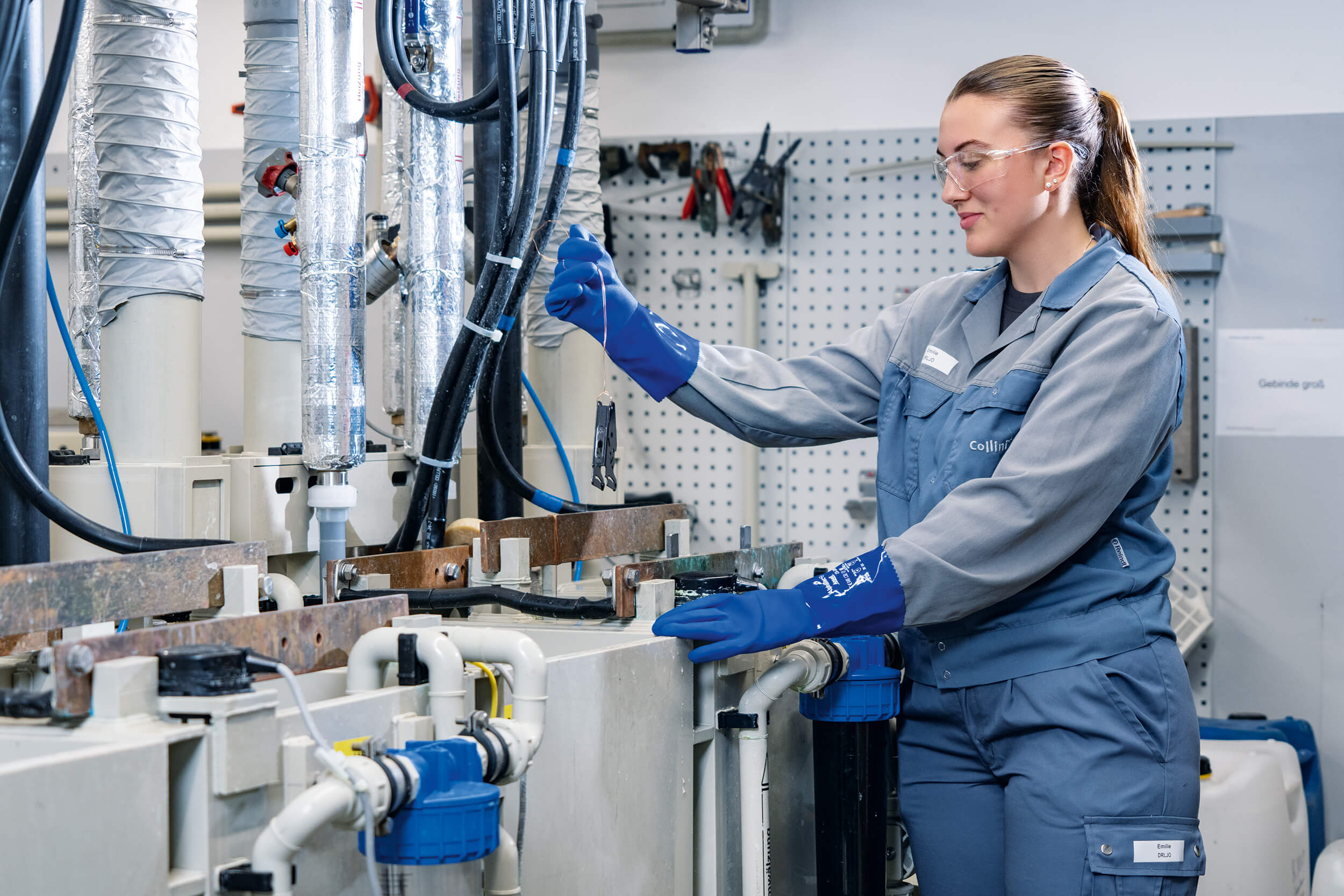 „Interesse an Chemie, handwerkliches Geschick und Bereitschaft zu entsprechendem Einsatz“ braucht es laut der angehenden Oberflächentechnikerin für diese Ausbildung. „Gerade im Sommer kann man bei der Arbeit an der Anlage und drumherum schon mal ins Schwitzen kommen“, schmunzelt Emilie. Die 18-Jährige absolviert gerade das dritte Lehrjahr bei Collini in Hohenems. An ihrem Ausbildungsplatz schätzt sie besonders, dass der Beruf sehr vielseitig ist und sie täglich etwas Neues lernt.