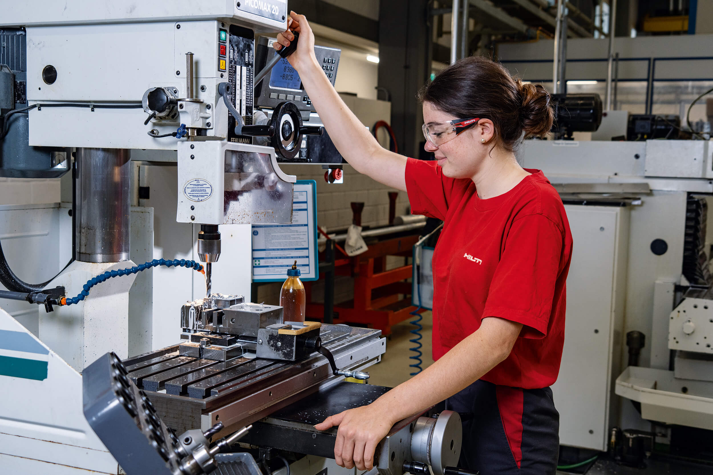Eigentlich verwundert es nicht, dass Emilie heute eine technische Lehre absolviert. Schließlich hat sie schon als kleines Mädchen bei ihrem Opa zu Hause in der Werkstatt mitgewerkelt. Technisches Verständnis und handwerkliches Geschick liegen ihr im Blut. „Die Schule habe ich mir einfach anders vorgestellt. Deswegen habe ich mich beim BIFO bezüglich einer Lehre erkundigt und mir Bürokauffrau, Elektrotechnik und Maschinenbautechnik angeschaut. Gerade der Vergleich zwischen technischen und kaufmännischen Berufen war wichtig für mich. Bei Hilti hat es mir dann auf Anhieb am besten gefallen“, zeichnet die 17-Jährige ihren Entscheidungsprozess nach.