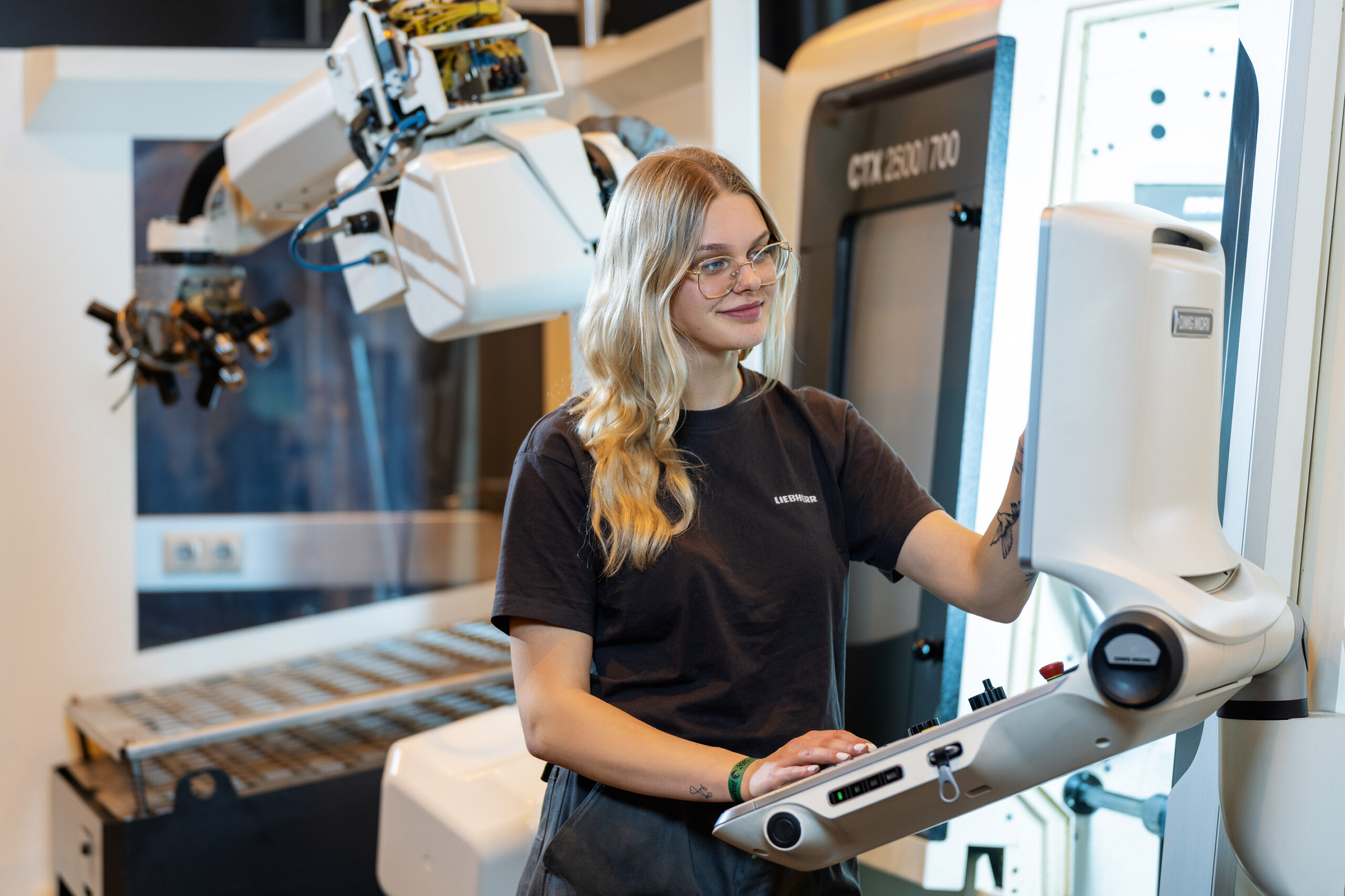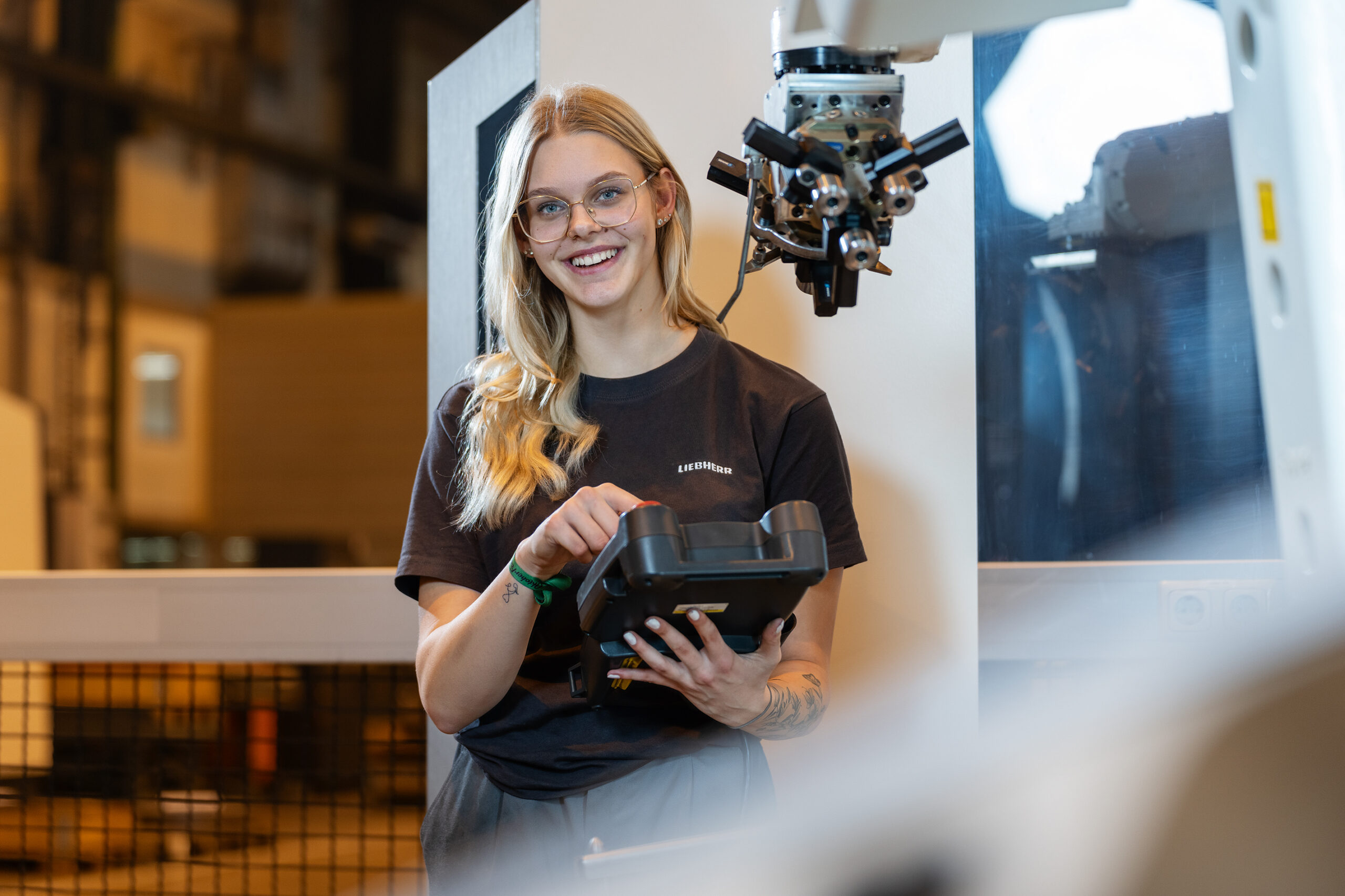 Seit drei Jahren und drei Monaten ist Tabea nun schon als Zerspanungstechnikerin bei Liebherr tätig, wo sie sich in erster Linie mit der maschinellen Herstellung verschiedenster Bauteile beschäftigt. Drehen, Bohren, Schleifen und Fräsen sind Teil ihres täglichen Arbeitsablaufs, der neben Präzision vor allem ein gutes räumliches Vorstellungsvermögen und jede Menge Teamwork erfordert. Dabei schätzt Tabea besonders das gute Arbeitsklima mit ihren Kolleg:innen und Ausbildern sowie die Vielseitigkeit ihres Berufs.