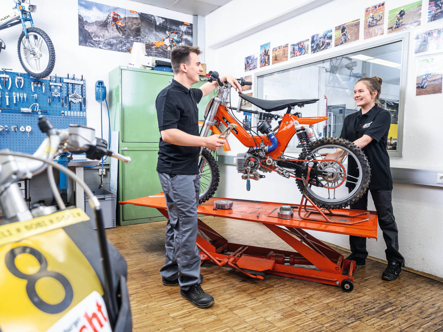 Ob es für die „Königsfrauen“ auch Unterschiede gebe? „Nein, die gibt es nicht“, weiß Elisabeth und ergänzt: „Manchmalsind gelegentliche Hebearbeiten nicht möglich … das ist aber auch alles.“ Letztlich komme es doch immer darauf an, den eigenen Weg zu finden. Hat man den einmal gefunden, rät Haris mit einem Augenzwinkern: „Streng dich an, es geht schließlich um deine Zukunft!“ Und die Anstrengung lohnt sich – ein mit Auszeichnung bestandener Lehrabschluss wird mit einem Kleinmotorrad belohnt.