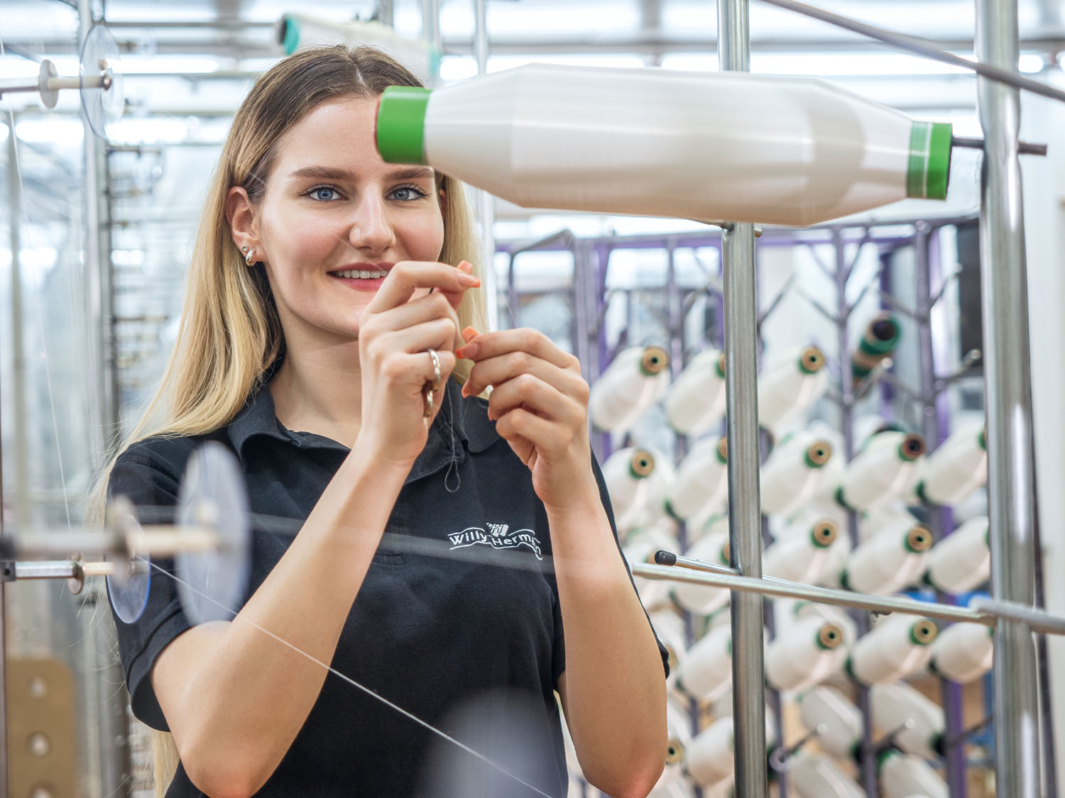 Bereits seit vier Jahren ist sie nun als Textiltechnologin bei Willy Hermann angestellt. Ihr Aufgabenbereich ist dabei weit gefächert. „Ich muss zum Beispiel erforderliche Materialien für den Einsatz an Strickmaschinen beschaffen und auswählen, dann die Maschinen anschließend in Betrieb nehmen und natürlich auch den Produktionsvorgang überwachen“, so Anastasija.