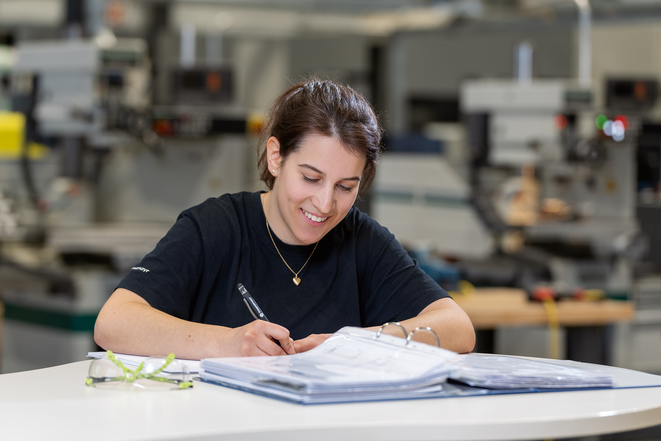 Los geht’s – in der Lehrwerkstatt Wir besprechen uns mit den Ausbildern, was heute ansteht. Dazu habe ich eine Mappe mit Infos und Werkstücken und deren Zeichnungen. Ich darf mir ein Werkstück aussuchen, das ich im Anschluss anfertigen werde. Ich kann das selbstständig entscheiden, und das gefällt mir sehr gut. Dann mache ich laut Fertigungszeichnung einen Plan und schreibe die einzelnen Arbeitsschritte auf.