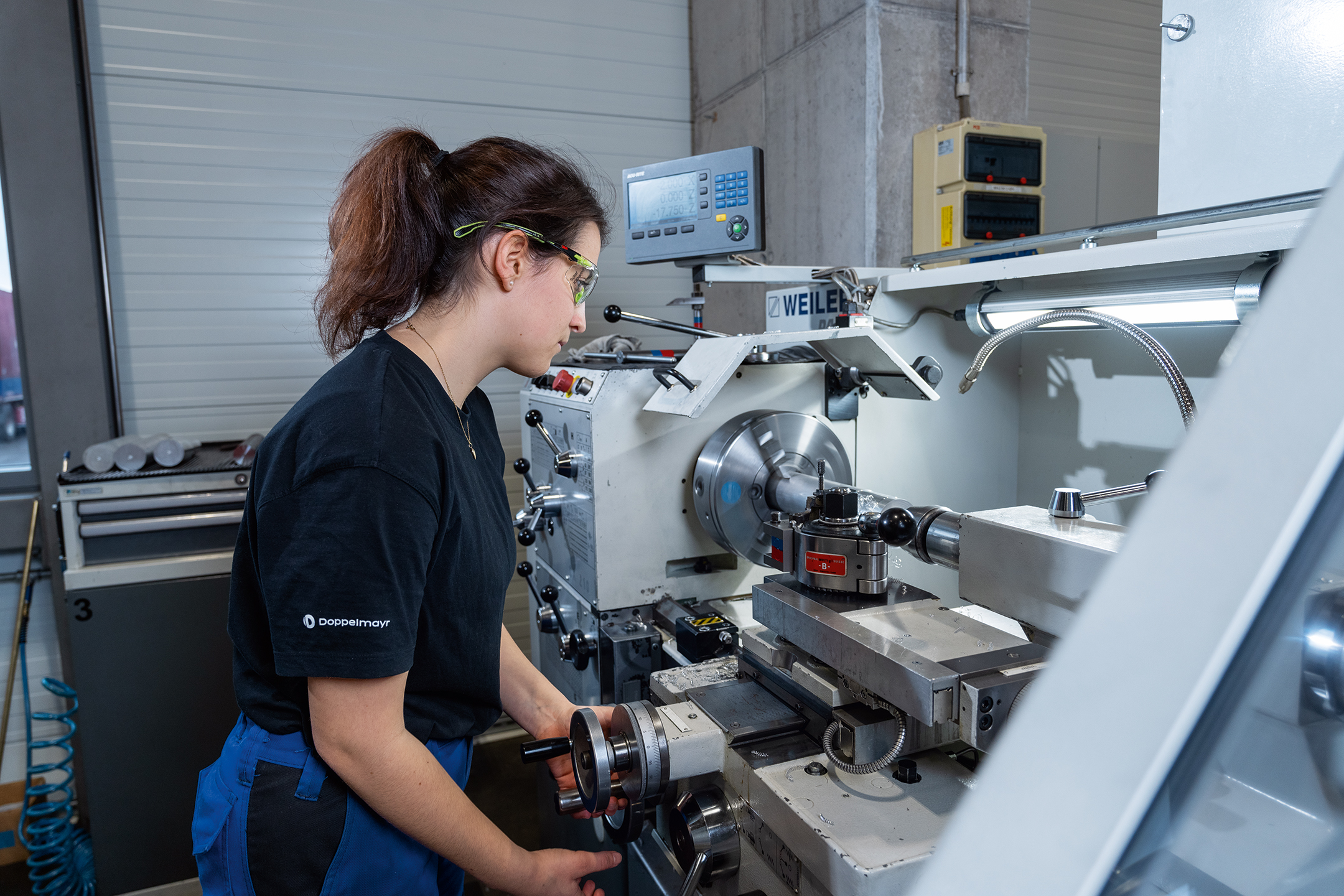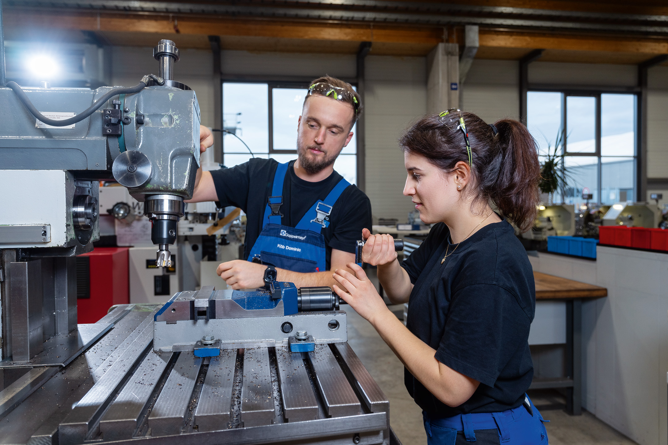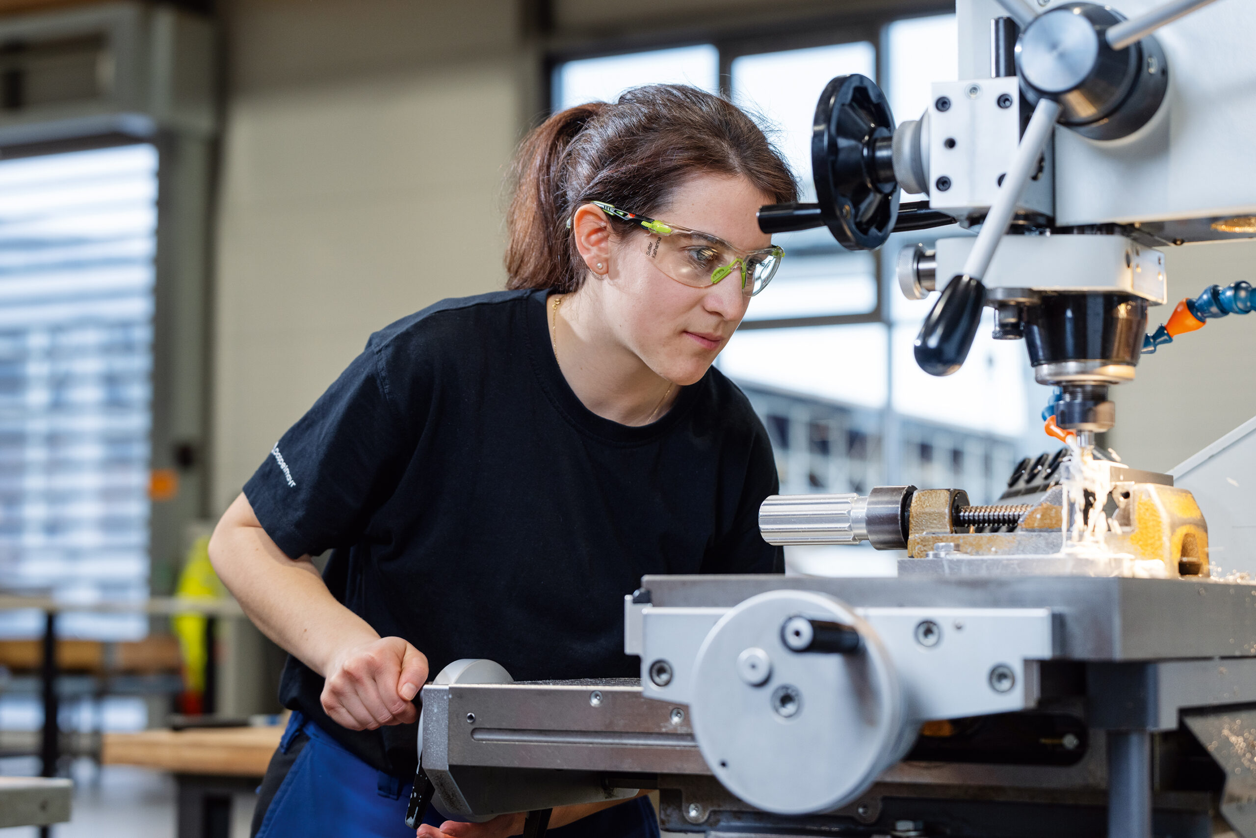 Hier sind wir gerade beim Drehen – das Werkzeug wird eingestellt und dann wird das Werkstück nach Plan gedreht. Wir lernen, wie man jedes Werkzeug so bedient, dass der Werkzeugverschleiß gering gehalten wird und die Oberflächen und das Maß perfekt werden. Wenn ich eine Frage habe, kann ich mich jederzeit an meinen Ausbilder Dominic wenden und er hilft mir weiter bzw. erklärt es mir genau.